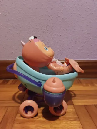 Cochecito para muñecas de Bebés Llorones. - Diseño en color azul claro y morado. - Ruedas de color rosa. - Incluye un accesorio con forma de biberón.