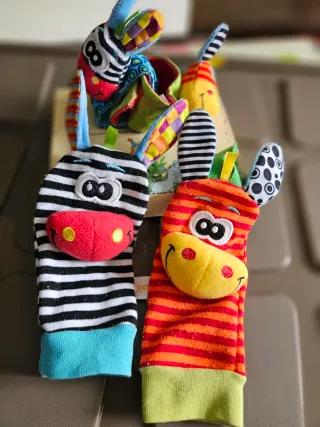 Set de sonajeros para bebé con divertidos diseños de animales. - Incluye sonajeros con forma de cebra y jirafa. - Diseños coloridos y llamativos. - Materiales suaves para el bebé.