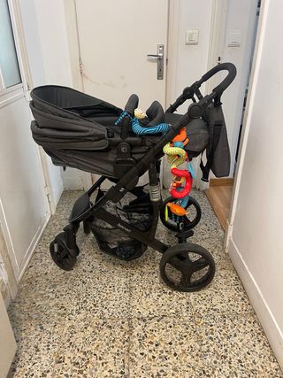 Cochecito de bebé en color gris, ideal para paseos cómodos. - Capazo amplio y confortable. - Silla reversible. - Plegado compacto. - Incluye cesta de almacenamiento. - Juguetes colgantes incluidos.