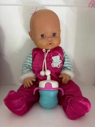 Muñeca Nenuco Mocoso con su biberón. - Mono rosa con detalles blancos y azules. - Biberón azul con asas y tapa blanca. Se le da agua con el biberón y le sale por la nariz como si fueran mocos.