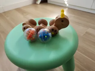 Juguete de madera con forma de gusano, ideal para los más pequeños. - Cuerpo segmentado de madera. - Ruedas de madera con detalles. - Dos sonajeros transparentes con figuras en su interior.