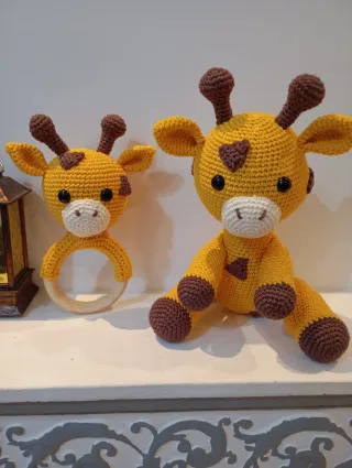 Conjunto de dos adorables jirafas tejidas a mano, perfectas para los más pequeños. - Jirafa de peluche y sonajero. - Aro de dentición de jirafa. - Hechas con hilo de algodón.
