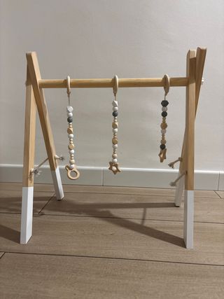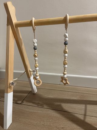 Gimnasio de madera para bebés, ideal para estimular el desarrollo. - Estructura de madera natural. - Colgantes de madera con formas. - Diseño moderno y seguro.