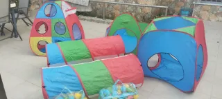 Conjunto de túneles y tiendas de campaña para juegos infantiles. - Incluye varias estructuras de juego interconectadas. - Diseñado con colores vivos y llamativos. - Ideal para el entretenimiento y desarrollo de los más pequeños. Todo valorado por 120€