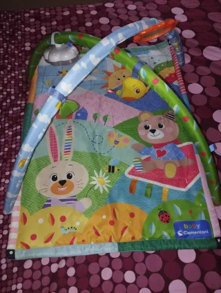 Manta de actividades para bebés de la marca Clementoni, con un diseño colorido y divertido. - Ilustraciones de animales como un oso, un conejo y una mariquita. - Incluye un arco con juguetes colgantes. - Base acolchada para mayor comodidad.