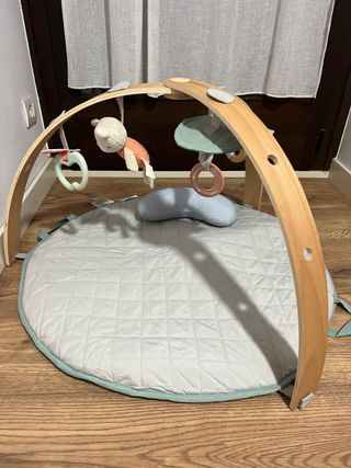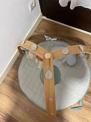 Gimnasio de madera para bebés, ideal para estimular el desarrollo. - Estructura de madera natural. - Incluye peluche de oso y otros juguetes colgantes. - Colchoneta acolchada redonda.