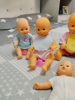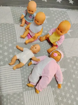 Conjunto de cinco muñecas bebé. - Muñecas de plástico. - Ropa de bebé variada. - Incluye chupete.