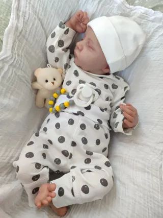 Muñeco bebé reborn con aspecto muy realista. Hecho a mano Kit réplica Emmy 45cm y 2.100gr aprox Vinilo con cuerpo de tela - Pelo injertado. - Ojos verdes - Lleva un pijamita puesto con su gorro - Pañal de recambio - Chupete imantado Y algún detallito más Un regalo increíble para las próximas comuniones.... O para ampliar tu colección Reborn... Su precio real en este caso serían sobre 300... Aprovecha la oferta!
