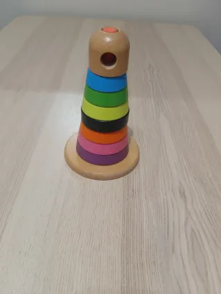 Juguete de apilamiento de madera para bebés. Juguete natural, respetuoso. Montessori. - Base de madera. - Aros de colores: morado, rosa, naranja, negro, amarillo, verde, azul. - Pieza superior de madera con detalle naranja.