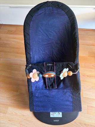 Hamaca para bebés de la marca BabyBjörn. Diseñada para ofrecer comodidad y seguridad. - Color azul marino y negro. - Incluye barra de juguetes con elementos de madera y tela. - Base negra. - Tejido acolchado.