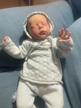 Preciosa muñeca Reborn con detalles realistas. - Aspecto de bebé dormido. - Ropa de punto azul con capucha. - Textura de piel suave.