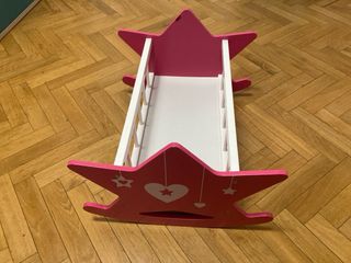 Cuna para muñecas Juguetos, en color rosa y gris. Está en buen estado. - Cuna plegable para muñecas. - Incluye cambiador, armario y trona (ver foto). - Diseño con estampado de lunares rosas.