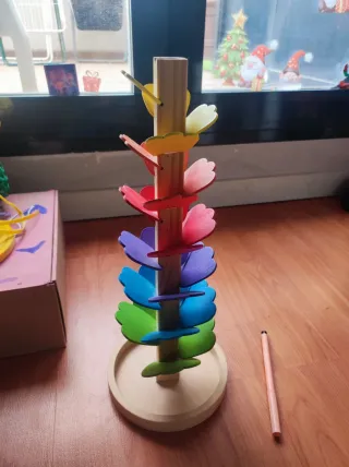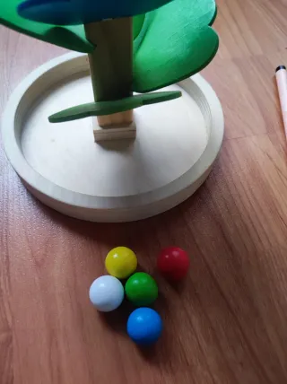 Juguete de madera con forma de árbol para bebés. Las bolitas ruedan por las hojas de colores. Algunas hojas del árbol se debe poner un papelito en la ranura para que se sujete la hoja, por lo demás está como nuevo. - Estructura de madera. - Hojas de colores: verde, azul, morado, rosa, rojo y naranja. - Base redonda de madera. Incluye 5 bolitas