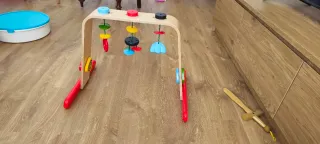 Gimnasio de actividades para bebés de la marca Leka. Fabricado en madera natural con detalles de colores. - Estructura de madera curvada. - Incluye varios juguetes colgantes de madera y silicona. - Base estable con soportes de color rojo. Hago envío o recogida por Monteolivete. En perfecto estado