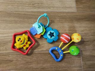 Juguetes para bebés en perfecto estado, listos para una nueva aventura. - Incluye pistola de agua, teléfono de juguete, reloj inteligente, mordedor, BB-8, hamburguesa de peluche y un juguete sensorial. - Los juguetes presentan colores alegres .. - Ideales para estimular la imaginación y el desarrollo sensorial del bebé.