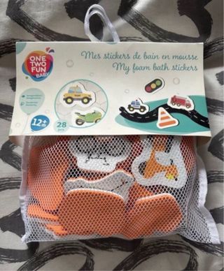 Set de piezas de espuma para el baño de la marca One Two Fun Baby. Fomentan la imaginación y la destreza. - Edad recomendada: 12+ meses. - Contiene 28 piezas. - Temática de vehículos y tráfico. Nuevo a estrenar