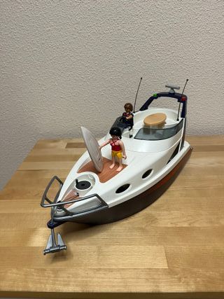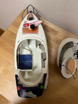 La cubierta es extraíble y el cable del ancla funciona. Con cama, cocina y baño. Dimensiones: 42 x 14 x 17 cm. Incluye utensilios de cocina, copas, bandeja, botes de conserva, cacerolas, capitán de yate y chica surfista.