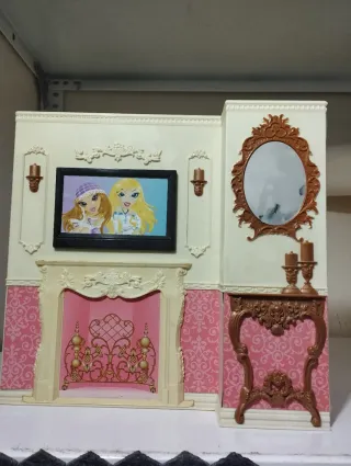 Set de baño para casa de muñecas Bratz. - Incluye ducha con mampara. - Inodoro con cisterna. - Lavabo con mueble. - Estantería. - Espejo. - Accesorios decorativos.