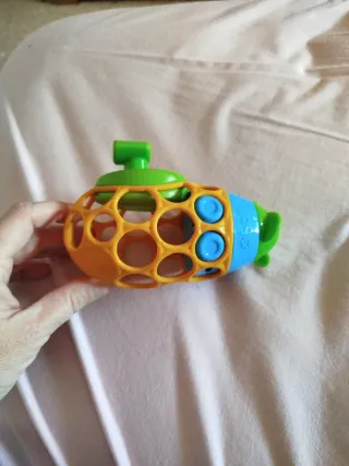 Juguete submarino de la marca Oball. Su diseño permite que los más pequeños lo agarren fácilmente. Se le puede dar cuerda girando la hélice y se mueve en el agua después. Ver última foto, tiene dos roturas en las uniones finas que no afectan al uso, de ahí el precio. - Colores: naranja, verde y azul. - Material: plástico flexible.