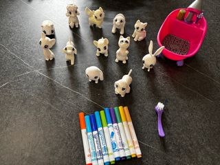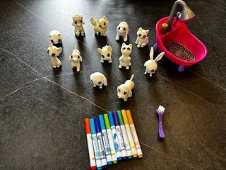 Set de Crayola Washimals, un juguete creativo que permite a los niños colorear, lavar y volver a colorear mascotas de juguete. El set incluye figuras de mascotas flocadas (con textura de terciopelo), rotuladores lavables, dos cepillos y una bañera. Los niños pueden personalizar las mascotas con los rotuladores y, cuando quieran un nuevo diseño, pueden lavar la tinta con agua y el cepillo en la bañera. La bañera funciona de verdad, expulsando agua de la ducha al pulsar un botón. Este juguete fomenta la creatividad y la motricidad, permitiendo una diversión sin fin al poder reutilizar las mascotas una y otra vez. En buen estado.