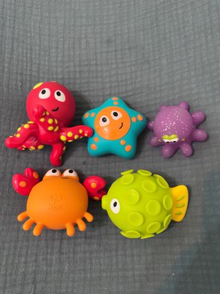 6 juguetes de baño de animales marinos. Son ideales para la hora del baño o incluso playa y piscina. - Incluyen un cangrejo, una tortuga, un pez, un pulpo, una estrella de mar y un caballito de mar. - Están hechos de un material suave y colorido. - Vienen en una práctica red para guardarlos. Con ventosas para poder engancharla en la pared de la bañera. - Nuevos, sin uso. - Tienda Imaginarium