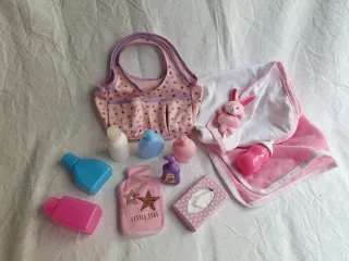 Conjunto de accesorios para jugar con muñecas bebé. Incluye varios complementos para el cuidado y paseo. Sin usar. - Bolso estampado de estrellas. - toalla rosa - peluche de conejo. - Biberón. - toalla o mantita blanca - Varios frascos y botellas. - Pañuelitos.