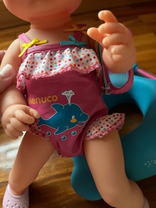 Muñeca Nenuco para el baño, ideal para jugar con burbujas. - Incluye traje de baño. - Diseño divertido con estampado de lunares y delfín.