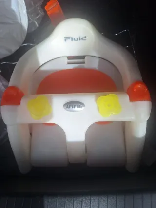 Silla de baño para bebés de la marca Jané, modelo Fluid. - Color blanco y naranja. - Diseño ergonómico para mayor comodidad. - Barra frontal de seguridad con juguetes. - Base antideslizante para mayor estabilidad.