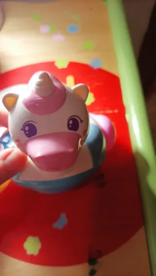 Juguete musical en forma de unicornio para el baño del bebé. Tiene música pero suena bajita, se usó solo una vez - Diseño colorido con partes en blanco, azul y rosa. - Marca VTech. - Altavoz en la parte trasera.