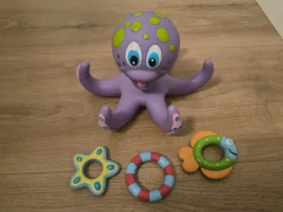 Set de juguetes para el baño, ideal para los más pequeños. Incluye un simpático pulpo morado con puntos verdes y tres sonajeros de diferentes formas. - Pulpo de goma. - Sonajero con forma de estrella. - Sonajero con forma de aro. - Sonajero con forma de pez.