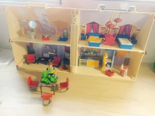 Casa de juguete Playmobil con varios ambientes y accesorios. Se venden los accesorios en bolsitas de plástico con las piezas ordenadas. Más colecciones en mi perfil - Incluye figuras y mobiliario. - Diseño de dos plantas. - Cocina equipada. - Dormitorios amueblados. - Baño (falta bañera) - Salón con sofás y mesa.