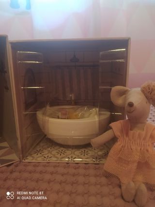 Éste precioso mini baño con bañera y accesorios para las más peques de Maileg será su rinconcito de relax después de un día largo. Viene en su caja de cartón duro y la bañera es metálica incluye accesorios de baño como cepillo y esponja diminutos. Es una versión antigua fabricada por Aizul Homey para la marca danesa Maileg. Es totalmente nuevo con etiqueta de tienda.