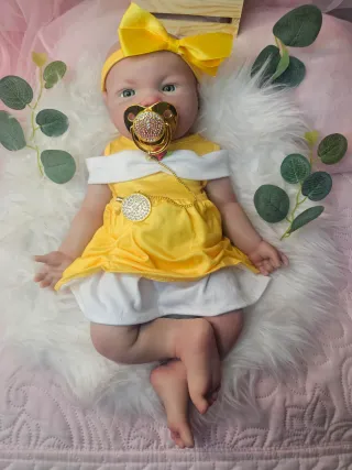 Muñeca Reborn de silicona completa, con un aspecto muy realista. Caida de cabeza como un bebe de verdad y se puede bañar. 🚺 Mide 45 cm 🚺 Pesa 2.500 kg aproximadamente - Completa de silicona platino - Incluye Ropita de la imagen. - Chupete de silicona y chupetero Disney Minnie Mouse - Pendientes puestos - Pañal - Hoja de cuidados - Certificado de Nacimiento - Caja Regalo Presentable. ✅ENVIO INMEDIATO 24/48H ✅RECOGER EN SEVILLA