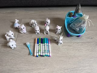 Set de figuras de mascotas para colorear con rotuladores Crayola y accesorios de baño. - Incluye 10 figuras de mascotas. - 8 rotuladores Crayola de colores variados. - Cepillo azul. - Bañera de juguete azul con grifo para lavar después. - dos disfraces
