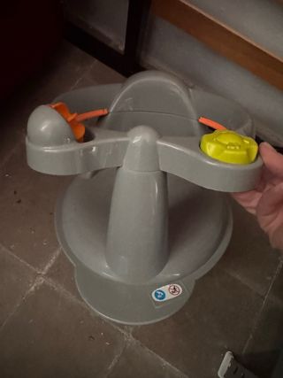 Sillón de seguridad para el baño del bebé. Ayuda a mantener al pequeño en una posición cómoda y segura durante el baño. - Color gris. - Con ventosas de sujeción en la base. - Juguetes interactivos incorporados.
