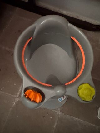 Asiento para baño de bebé, en buen estado. Ideal para bañar a tu pequeño con comodidad y seguridad. - Asiento ergonómico y cómodo para el bebé. - Juguete incorporado para entretener al bebé durante el baño. - Material plástico resistente y fácil de limpiar. - Color turquesa y naranja. Nunca funcionó bien el animalito de en medio que al pulsar echa agua.