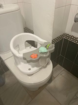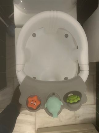 Adaptador de baño para bebe. Esta muy poco usado, practicamente nuevo. Tiene abertura delantera, sujeccion con ventosa en la base, giratorio y con juguetes.