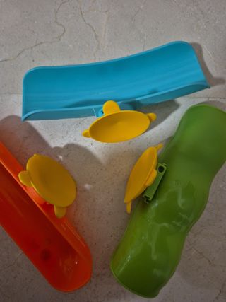 Juego de juguetes para el baño en buen estado. Son 4 piezas coloridas y divertidas con diseños de caritas sonrientes. Ideales para que los más pequeños se diviertan en la hora del baño. - Incluye 3 toboganes de diferentes formas y colores con ventosa. - Un juguete con forma de pez.