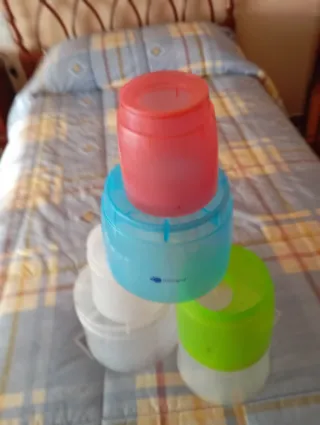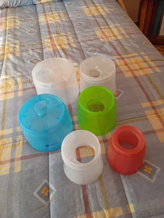 Conjunto de cubos de plástico de colores para jugar en el baño. - Cubo azul - Cubo verde - Cubo rojo - Dos cubos blancos translúcidos