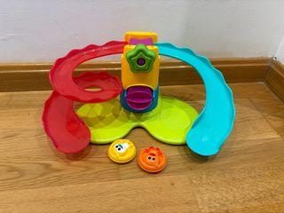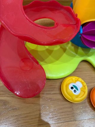 Divertido juguete para la bañera con toboganes y fichas. - Incluye dos fichas flotantes. - Colores: rojo, azul, amarillo, verde y morado. - Base con forma de hoja.