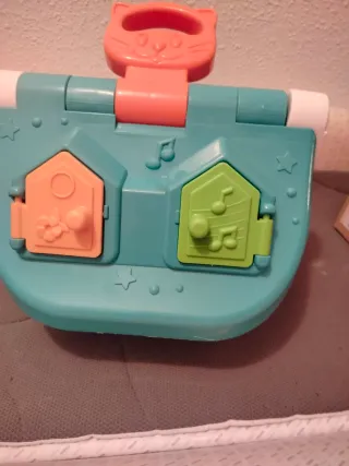 Juguete interactivo para bebés con un diseño divertido y colorido. - Asa superior con forma de gato. - Dos puertas frontales, una naranja y otra verde. - Detalles decorativos como estrellas y notas musicales. - Tiene dos juguetes donde se mete en los agujeros pero falta solo uno