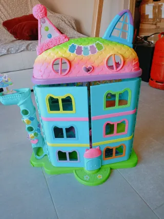 Casa de juguete temática de Gabby's Dollhouse, con un diseño colorido y divertido. - Techo con forma de orejas de gato y detalles de arcoíris. - Puertas abatibles. - Múltiples niveles y estantes para jugar.