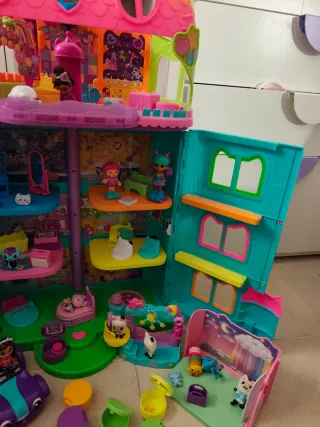 Casa de muñecas de Gabby Gato con múltiples niveles y accesorios. - Incluye figuras y mobiliario. - Diseño colorido y detallado. - Puertas y ventanas abatibles. Perfectamente nueva, los reyes del año pasado parece ser que no acabaron de acertar y está como atrezzo de la habitación de mi hija 🤷. La casa sola nueva vale 100 euros, en accesorios hay otro buen pico invertido
