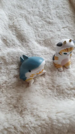 Conjunto de dos adorables figuritas de gatos Mofusand. Las conseguí en un gacha de Japón originales. - Una figurita de gato con disfraz de tiburón. - Otra figurita de gato con disfraz de vaca.