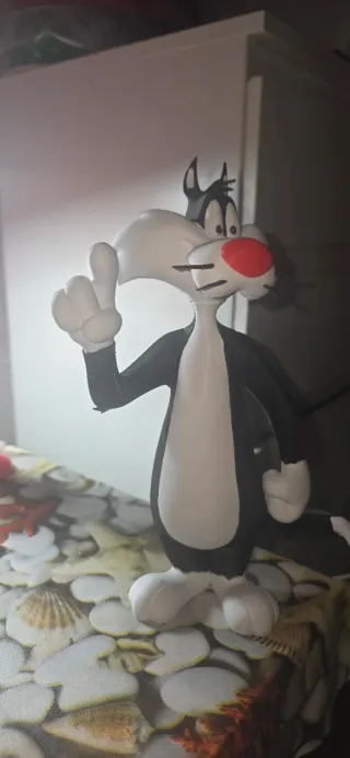 Figura decorativa del personaje Sylvester el Gato, ideal para coleccionistas. - Diseño tridimensional. - Colores blanco y negro característicos. - Echo con impresora 3D