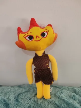 Peluche de personaje con diseño de gato. - Cuerpo y brazos de color amarillo. - Cabeza con detalles en rojo y naranja. - Viste un traje marrón con estampado. - Ojos y boca bordados.