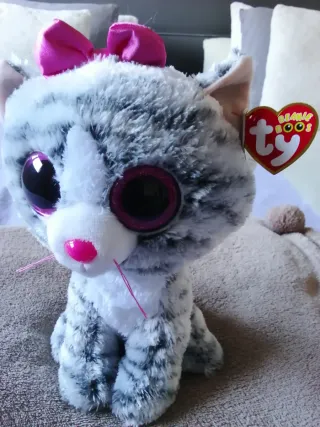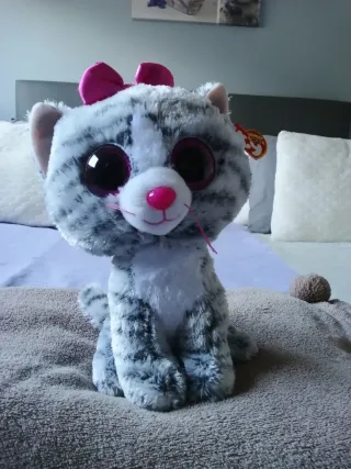 Adorable peluche de gato con rayas grises y detalles en rosa. Es un artículo de la marca Ty, conocido por su calidad y diseño. - Diseño de gato con rayas grises. - Orejas y nariz en color rosa. - Lazo rosa en la cabeza. - Ojos grandes y brillantes característicos de la línea Beanie Boos. - Altura unos 25 cm.