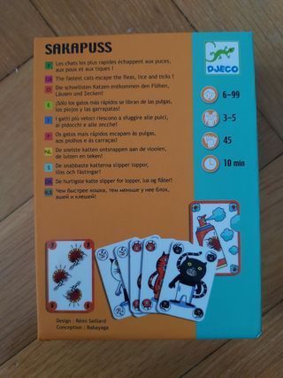 Perfecto estado. De 3 a 5 jugadores. Recomendado a partir de 6 años. Instrucciones: Hay que separar una de lass cartas gato y dársela al jugador de la izquierda sin que nadie la vea, cuando tengas los cuatro gatos iguales, coloca la mano en el centro de la mesa. ¡Solo los jugadores que piensen y actúen con rapidez escaparán de la molesta plaga de piojos, garrapatas y pulgas!