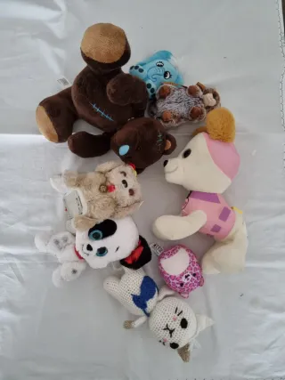 Conjunto de peluches de diferentes animales y diseños. - Peluche de oso marrón grande. - Peluche de perro blanco con manchas negras. - Peluche de gato blanco tejido a mano. - Peluche de perro blanco y marrón (con pilas se anda aunque tiene una patas rotas) - Peluche de elefante azul. - Peluche de erizo. - Peluche de perro blanco y rosa, Skye de la Patrulla Canina. - Peluche rosa con estampado de leopardo.