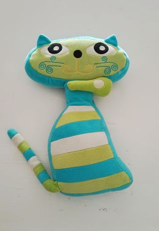 Precioso peluche con forma de gato de Ale Hop. Es suave y tierno, ideal para niños. - Diseño de gato rayado en azul y verde. - Suave al tacto. - Perfecto para abrazar.